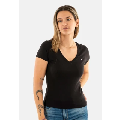 Tommy Jeans Women’s Short Sleeve V Neck Slim T Shirt, Black (Black), XS