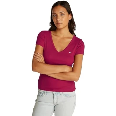 Tommy Jeans Womens Tjw Slim Essential Rib V Dw0dw17385 S/S T Shirt, Red (Brilliant Berry), S UK
