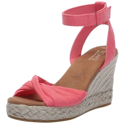 Twist wedge sandal with rope wrap and textile uppers Features ankle strap with adjustable hook and loop closure High-rebound comfort OrthoLite Eco X40 Hybrid insoles made with 32% eco content (15% waste foam, 5% recycled content and 12% bio-oils) Custom TOMS rubber outsole Wedge height is approximately 3 1/2”