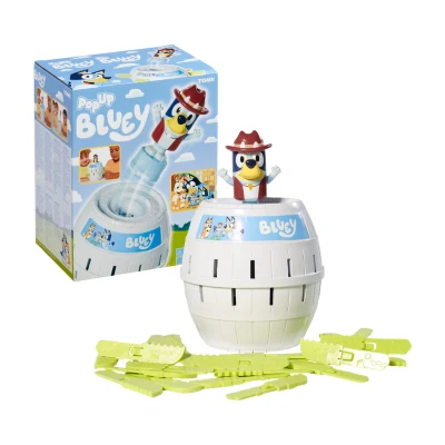 Pop Up Bluey is a fun family game where players insert crocodile sticks into a barrel featuring Bluey, waiting for her to pop up unexpectedly. With randomized slots and simple rules, it's perfect for children ages 4 and up—no batteries required.