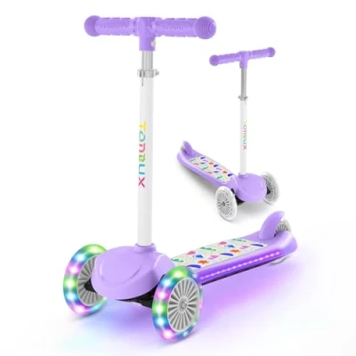 Smoother & Safer: This light up scooter is suitable for children ages 2-6 and has a 50kg load capacity on the base plate. The non-slip handles and footrests as well as the wear-resistant PU two front wheels and one rear wheel make for a safe and stable ride. Children can stop safely by pressing their feet directly on the floor or the foot brake on the rear wheels. This three wheel scooter is ideal for developing children's self-confidence and sense of balance Lightweight & Compact: This scooter 3 wheels is a good choice for kids ages 2-6 to ride around indoors or outdoors. The kids 3 wheel scooter will be a big surprise loved by toddlers. This childrens scooter will allow your children and his friends to have a happy time and a fun ride Light-Up Wheel & Deck: The LED flash design on both sides of the pedals adds childish fun and makes night riding even cooler and eye-catching. When the switch is turned on, there are two light modes that cycle alternately, a scrolling mode and a flashing mode. There are two light colours, blue and white. In addition, the three wheels emit a brilliant bright light while riding. This scooter for toddler will give kids to have a gorgeous childhood Millimetre Height Adjustable Handlebars: This height adjustable scooter is great for growing children. This height adjustment is in millimetres. You can easily adjust the height according to your child's height Lean to Steer Design: Instead of wrestling with tricky handlebars that twist and turn to steer, this kid scooter has a simple tilt steering system. It's specially designed to steer according to the direction of your children's tilt, making it easy for kids to take control of the steering wheel while scooting. Tilt gently to the left and the tri scooter will steer left; tilt gently to the right and the toddler scooter will steer right Note: To install the scooter please follow the instructions. Be careful to make sure the screws holding the battery box are secure when installing. The battery compartment is held in place by 2 screws. If one of the screws is missed or if the screw slips loose, it can happen that the battery compartment falls and touches the ground. If there is any problem during the installation, you can contact us at any time