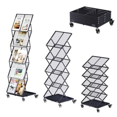 tonchean Foldable Magazine Rack 5 Layer Adjustable Height Stand Metal File Holder Floor Standing Literature Brochure Display with Wheels for Exhibition Trade Show Office Hotel