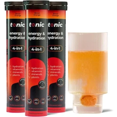 Tonic Health Energy and Hydration Tablets 15 Vitamins, Minerals, Plants with Panax Ginseng, No Sugar Effervescent Multivitamins Rehydration Electrolytes Tablets, Blood Orange 60 Count