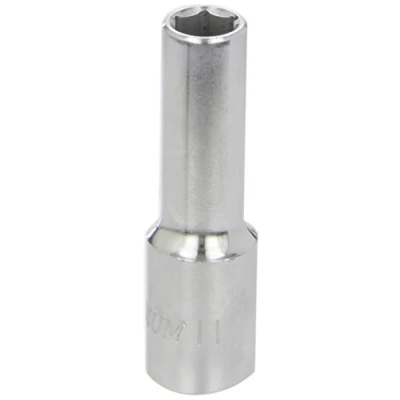 Size: 11mm single Hex x 1/2"D. Deep socket, depth: 77mm. Hex (6pt) head drives from the flats to provide more torque, ideal for damaged or seized nuts & bolts. Manufactured from chrome vanadium with a polished finish. Part of a range of deep sockets available individually. For other sizes, please see Laser Part Nos. 1982 - 1996 (10mm to 31mm).