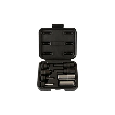 Applications include: Bosch, Denso & Siemens injectors. Includes the Injector ball valve lapping tools and guide. 3 x injector ball valve lapping tools, 10mm Hex x 7.6mm, Denso CR injector valve seat removal tool, 8 sided socket for Bosch CR injectors, internal fixing removal tool for Siemens CR injector. Manufactured from chrome vanadium and steel.