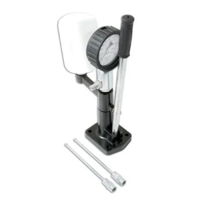 Calibrated hand pump with 3 1/2" dial reading 0 - 600 bar (0 - 8700lbs/in²) Complete with transparent plastic tank and filter Two connecting pipes, sizes: M12 and M14 Measures in lbs/in²