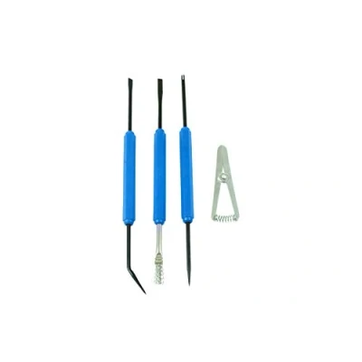 Contents include: Heat Sink, Wire Brush, Scraper and Dual Probe tool. Heat sink dissipates heat from sensitive electronic components. Fine point probe helps position delicate electronic components. Wire brush and scraper clean circuits for successful soldering. Slotted probe holds and positions wire.
