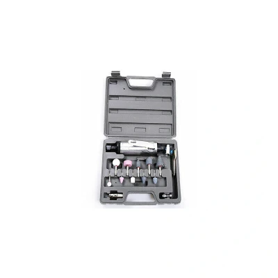 General description This professional quality air tool set is ideal for grinding and polishing metal components. The air die grinder is well made and features a safety trigger that requires a flick of the thumb to release before the handle can be operated, preventing accidental operation. The kit includes 10 mounted grinding stones with 1/4 inch and 1/8 inch shanks, and it is supplied complete in a carrying case. Technical specifications Type: Air Die Grinder Diameter shanks: 1/4 inch (5 mounted grinding stones), 1/8 inch (5 mounted grinding stones) Collet: 1/8 inch BSP Nipple: 1/4 inch Includes: 2 spanners Air inlet: 1/4 inch NPT Requires: 3/8 inch hose (not supplied) Free speed: 22,000 RPM Air pressure: 90 PSI Air consumption: 3 CFM Air tool length: 17 cm (6.75 inch)