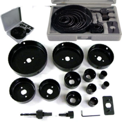 General description New 16pc Holesaw Set designed for professional quality cutting. This set includes 13 carbon steel holesaws, 2 arbors, 1 reinforced metal plate, and 1 allen key, all housed in a blow-moulded storage case. Technical specifications Includes holesaw sizes: 19mm, 22mm, 25mm, 28mm, 32mm, 38mm, 44mm, 51mm, 64mm, 76mm, 89mm, 102mm, 127mm Material: Carbon steel Compatibility and accessories Compatible with timber, plastic, fibreglass, chipboard, craftboard, plaster, drywall, aluminium, and thin sheet metal Includes 2 arbors and 1 reinforced metal plate Comes with 1 allen key