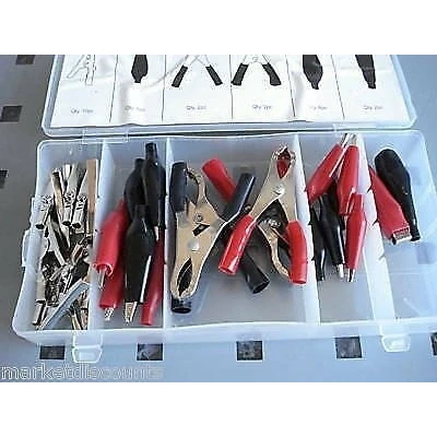 Set of 28 assorted electrical clips. Includes; 6 x 50mm alligator clips, 6 x 38mm alligator clips, 10 x mini alligator clips, 2 x 30amp charging clips, 2 x 25amp charging clips, 2 x 10amp charging clips. All contained in a handy plastic storage box