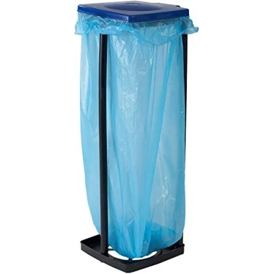 Garbage bag holder with lid and black plastic frame for garbage bags up to 120 liters — with lid in blue or red (assorted colors — delivery subject to availability) 3-way height-adjustable waste bag holder by effortlessly inserting the bars together — suitable for the kitchen, garage, cellar or camping and also suitable for the yellow bag Dimensions (WxHxD) approx. 87 x 67 x 47 cm (height adjustable in 3 steps), weight approx. 725 g, suitable for garbage bags up to 120 liters Garbage bags can be hung in place without slipping thanks to the integrated clamping ring — the frame is easy to clean thanks to high-quality, smooth plastic Box contents: 1 x trash bag stand (1 x lid with clamping ring, 1 x base plate, 12 x poles)