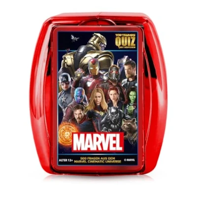 The ultimate Marvel quiz: the superheroes of Marvel such as Spiderman, the Guardians of the Galaxy or Captain America meet the most exciting quiz game of all time From 12 years – you are 12 years old or even older and at least 2 players? Then nothing stands in the way of the ultimate puzzle fun 500 exciting questions – test your knowledge about the Marvel Cinematic Universe and its heroes such as Thor, Iron Man, Groot and many more Safely packed – thanks to the robust box with 2 folding compartments, this Marvel game is also suitable for puzzle fun on the go MERCHANDISE FOR MARVEL FANS - This quiz game is the perfect Marvel fan item for anyone who is inspired by Hulk, Black Panther, Captain Marvel and other superheroes, Manufacturer: Winning Moves