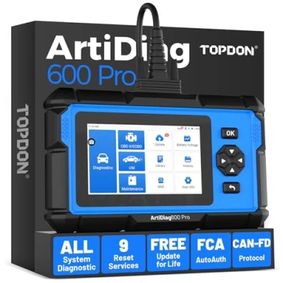 FULL-SYSTEM DIAGNOSTICS: The new Topdon diagnostic tool ArtiDiag600 Pro (AD600 Pro) is an upgraded version of the AD600, AD600S, and AD500. It provides broad diagnostic coverage for major vehicle systems such as the engine, transmission, ABS, BCM, airbags, powertrain, chassis, and more. With features that allow you to read and clear DTCs, check ECU information, and view real-time data streams, this OBD2 scanner supports accurate and efficient troubleshooting. 9 ESSENTIAL MAINTENANCE FUNCTIONS: The AD600 Pro OBD2 scanner provides nine commonly used maintenance functions, including ABS Bleeding, Battery Matching, Brake Reset, Oil Reset, DPF Regeneration, Throttle Relearn, Injector Coding, SAS Reset, and TPMS Reset. These functions make the Topdon AD600 Pro a dependable tool for handling routine service tasks and various maintenance needs. LIFETIME FREE UPDATES & SMART FEATURES: The ArtiDiag600 Pro automotive scan tool offers lifetime free updates to help keep the scanner current with new features and improvements. With functions such as online feedback and one-tap code clearing, it provides a convenient and user-friendly diagnostic experience for both DIY users and professionals. WIDE COMPATIBILITY WITH 90+ VEHICLES & 15 LANGUAGES: The Topdon automotive diagnostic tool supports a broad range of vehicle brands from the US, Europe, and Asia. Whether you are working on a sedan, SUV, or light truck, the ArtiDiag600 Pro provides versatile coverage for everyday diagnostic needs. It also supports 15 languages, allowing you to switch among English, French, German, Spanish, Portuguese, Russian, Japanese, Italian, Simplified/Traditional Chinese, Korean, Polish, and Turkish for easier operation. ADVANCED LIVE DATA VISUALIZATION & REPORTS: The ArtiDiag600 Pro scan tool allows you to read and clear DTCs, record live data streams for later review, view up to four parameters simultaneously, and generate detailed diagnostic reports. AutoVIN technology helps identify the vehicle quickly and accurately, making the diagnostic process more convenient. ADVANCED AUTOVIN & ECU IDENTIFICATION: OBD2 scanner ArtiDiag600 Pro featuring smart AutoVIN technology automatically detects your vehicle's VIN, ECU name, ECU identifier, and ECU serial number, speeding up the diagnostic process and system compatibility. This feature streamlines initial setup, helps improve efficiency and accuracy SECURE FCA AUTOAUTH & FAST CAN-FD SUPPORT: The topdon ad600 pro obd scanner is equipped with FCA AutoAuth technology, allowing secure access to FCA (Fiat Chrysler Automobiles) vehicle systems for authorized repairs and diagnostics. Additionally, the obd code reader supports the latest CAN-FD (Flexible Data Rate) protocol, helping the scanner work effectively with modern vehicle communication systems.