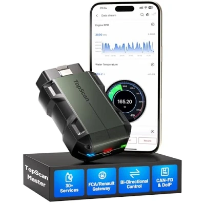 [Send Commands Directly to the Vehicle for Faster Diagnosis] - TopScan Master’s bidirectional control lets you test and trigger components like windows, headlights, injectors, and fuel pumps on the spot. With instant feedback, you can pinpoint the root cause quickly and accurately without unnecessary disassembly. [Scan Every System, Diagnose Faster Anywhere] - This Bluetooth OBD2 car scanner delivers comprehensive full-system diagnostics, giving you OE-level access to every vehicle module, from the engine and transmission to ABS, A/C, and beyond. With its wireless portability, technicians can perform reliable repairs on-site or in the garage, right from their phones. [30+ Maintenance Functions for Reliable Services] - With 30+ essential reset and maintenance functions, TopScan Master handles everything from Oil and DPF resets to advanced calibrations like injector coding and gearbox matching. Covering nearly all repair needs, it helps save time, streamline workflow, and deliver professional-level service. [Instant Access to Vehicle Repair Knowledge] - Built-in repair resources put OBD DTC guides, Technical Service Bulletins, DLC locations, and warning light libraries right at your fingertips—so you can diagnose and repair with confidence without ever leaving the vehicle bay. [120+ Brand Coverage with Advanced Protocols and Gateway Access] - Equipped with CAN-FD and DoIP, this car code reader handles modern vehicles like GM and Chrysler (2020+), BMW F/G chassis, and Land Rover (2017+). SGW gateway access lets you perform unrestricted diagnostics on FCA, Renault, and Nissan. With coverage for 120+ global brands, it replaces multiple tools and cuts equipment costs. [TopFix AI Assistant Simplifies Complex Repairs] - TopFix AI enhances diagnostic efficiency by interpreting fault codes and producing detailed, step-by-step repair procedures. Supported by professional repair documentation, including comprehensive wiring diagrams and connector pinouts, both new and experienced technicians can handle complex repairs with confidence. [45 Languages Menu, Local Tech Support] - With support for 45 languages, TopScan Master removes barriers for global users. Backed by responsive local tech support, you’ll always have expert help when you need it. [1-Year Free Updates with Flexible Renewal Options] - Includes 1 year of free updates to keep your coverage current. Afterward, choose monthly, quarterly, or yearly renewals to match your needs. Even without renewal, core functions like full-system read/clear codes and live data remain fully usable.