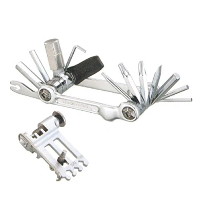 Professional quality, one piece, light weight folding tool offering hardened steel tools with 20 functions. A forged aluminium body resists torque. Tools Include : 2, 2.5, 3, 4, 5, 6, 8, 10mm Allen keys, T25 Torx wrench Tools include : Hard-anodised alloy tyre lever, Spoke wrenches (15g/14g/Mavic M7/Shimano compatible), Phillips & flathead screwdrivers and Steel bottle opener with spoke holder Chain tool - compatible with all chains except Campagnolo 11 speed hollow pin chains. Includes Chain Hook. Includes self-tightening tool and a neoprene bag. The perfect tool for endurance racing, training and touring.