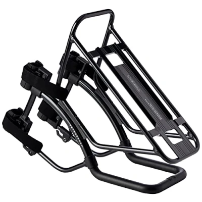 Quick-mount front rack system for MTB suspension forks or rigid forks without rack eyelets Features an innovative top plate that adjusts to level the fork angle Integrated QuickTrack system allows Topeak Trunk Bags to slide and lock into place and release with a the push of a button Included clamp allows mounting of reflector Max Load Capacity 10kg