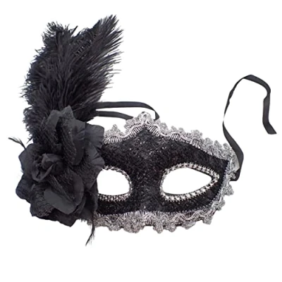 Topkids Accessories Feather Masquerade Mask, Venetian Mask Halloween Masks for Ball, Fancy Dress Adult, Cosplay accessories, Black Lace, (Silver Trim)