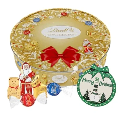Indulge in the ultimate Lindt chocolates experience this holiday season with the Festive selection of irresistible smooth assorted chocolate truffles, presented in the Golden Wreath Tin 400g gift box with Topline Christmas tree decoration. This beautifully presented sweets gift box is the perfect way to spread joy, warmth, and sweetness during the festive season. Whether you're looking for delightful stocking fillers or memorable Secret Santa gifts for women. This Christmas chocolates gift box is a treasure love of truffle delights. With an assortment of Festive delectable selection includes: Milk Chocolate Truffes with a smooth melting filling, golden teddy 10g, reindeer 10g and Santa 40g figures, there's a truffle to please every palate. Share the joy of discovery with your loved ones as they savor these luscious treats. Ideal for Any Occasion: this truffle chocolate gift is a versatile gift solution, perfect for any celebration. Whether you're looking for a romantic gesture for your significant other, a thoughtful Christmas gifts for women, or a fun and classy Secret Santa gifts for men, this box of chocolates fits the bill. Its festive yet timeless design makes it ideal for stocking fillers, birthdays, anniversaries, or simply as a way to say "thank you" to someone special. Perfectly Size - this festive season decorated tin is just the right size to slip into a stockings, making it a delightful surprise for kids and adults alike. It's also an excellent option for office Secret Santa exchanges, as it adds a touch of luxury to the Xmas gift-giving tradition. Christmas Topline Hanging Ornament – Snowman & Trees Design: crafted in a round, lightweight wooden bauble shape with a cheerful snowman and evergreen trees, it’s framed by a green border decorated with white stars and topped with a large festive bow. Dimensions: 7.9cm x 7.4cm Perfect for Christmas trees, gift embellishments or holiday décor accents. Make Every Moment Special: whether you're spreading joy during the holiday season, expressing gratitude, or simply treating yourself, the Assorted Truffle Chocolates Gift Box transforms every occasion into something extraordinary. With its luxurious flavors, elegant presentation, and personalize accessories, this gift box is more than just chocolates – it's a celebration of sweetness, elegance, and heartfelt connection. Treat yourself or someone special today!