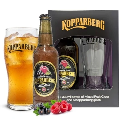 Kopparberg alcohol gift set, that fruit cider fans will love. Included in the pack are 1 x 330 ml bottle of mixed fruit cider and a Kopparberg branded glass. What we noticed is that the brand is offering the same products and on-pack offers, but the beverage packaging designs are different. Learn what makes them stand out! Kopparberg Mixed Fruit Cider - Sweden's original cider brand, made in Kopparberg town in the heart of the country. The juice of blackcurrants and raspberry are added to our apple cider to deliver are truly unique, fruity taste, rich in color and refreshing down to the last drop. We hope you enjoy this very special cider! Looking for the perfect Christmas Secret Santa Gifts for Men or Women? Festive Cider Gift Set for Him or for your Precious One, Stocking Fillers, Mens Gifts Set, Thank You Gifts, Dad or Grandad Gifts. An ideal present for Birthday gifts for Her. Kopparberg Gift Set isn’t just for Christmas. There’s a for every occasion. Whether it’s special or not that special. Official cider pint glass - this wonderful, official Kopparberg cider glass is highly decorated and features the company logo in a large font. Dimensions: 8cm diameter at rim, 18cm height. The toughened glass ensures this is the perfect way for celebrating the long, summer days outdoors with an ice-cold drink. From the first drink of the afternoon to the last drink of the evening; we’ve got you covered with a range of premium drinks that bring flavour and refreshment to every occasion. Whether you’re looking for spirits, fruit cider or something lighter – be sure to make that first sip one to remember this Kopparberg season.