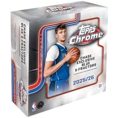Topps Chrome Basketball is back and better than ever: Step into the hobby with 2025 Topps Chrome Basketball, a factory sealed box of NBA basketball cards that pairs Topps design with chrome shine. Open packs of basketball trading cards featuring rookie standout Cooper Flagg alongside stars Stephen Curry and Lebron James in Chrome Basketball Cards made for any basketball fan. What’s Inside the Mega Box: Unwrap 7 packs with 6 cards per pack for 42 total basketball cards for a full-court collecting experience. Each basketball card box can include a mix of base cards, insert cards, parallels, and a chance at autographed basketball cards, featuring rookies like Dylan Harper and Kon Knueppel plus veteran Nikola Jokic all connected through the legacy of Topps Basketball. Build the Foundation of Topps Chrome Basketball: Collect the complete 299-card base checklist of collectible basketball cards that span nba rookie cards, veteran stars, and legends like Kevin Durant, Jalen Brunson, and Kon Knueppel. Discover exclusive basketball parallels in different colors plus classic Refractors that make your Topps basketball cards shine. Insert and Short Print Highlights: Discover a wide range of basketball insert cards and super short print cards that celebrate the moments of NBA. Look for Ball of Duty, Activators, Serenity, Go Time, Inspirational, Youthquake, Sleek Finishers, Voices, Destiny, and Instinct, plus SSPs including Advisory, Paradox, LETS GO!, Glass Canvas, Patented, Helix, Finals, and Fanatical for collectible rare basketball cards. Autograph Card Lineup: Explore autograph cards across Topps Chrome Autographs, Future Stars Autographs, Topps Autograph Issue, Chromographs, and Stratospheric Signatures. Look for signatures from Jayson Tatum, Larry Bird, and Shaquille O’Neal that bring an added layer of connection to any basketball cards and sports trading cards collection. Gold NBA Logoman Relics & Autograph Relics: 2025–26 Topps Chrome Basketball features Gold NBA Logoman Relics numbered to 4, each featuring a patch from early season jerseys worn by MVP Shai Gilgeous-Alexander, Rookie of the Year Stephon Castle, and Defensive Player of the Year Evan Mobley, plus 1-of-1 Gold NBA Logoman Autograph Relics that headline any collection., Manufacturer: Topps
