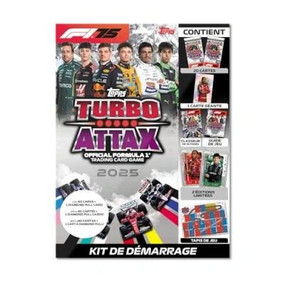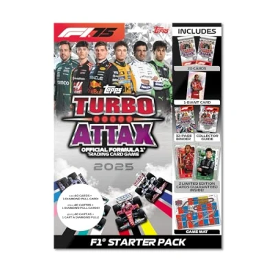 This online exclusive Starter Pack contains 40 Turbo Attax cards including an Emerald Andrea Kimi Antonelli LE, a Ruby Lewis Hamilton LE and a guaranteed Diamond Pull card. Also contains a Giant Supernova Lewis Hamilton card, a collector binder with covers, a game mat plus a 16-page collector guide. This collection is super-charged full of new categories such as Rainmaster, Team Dynasty, Pole Position, Track Profiles, National Pride, Rookie Rising, F2 Team cards, F3 Team cards, Pit Stop Pros and Constructor Kings Turbo Attax 2025 also contains returning favourites such as Podium Power, 100 Club, F1 Super Novas, Stars of Tomorrow, Epic Moments plus the biggest ever collection of Legends, with 18 Icons of the Grid cards to collect. Official F1 Licensed product!, Manufacturer: Topps