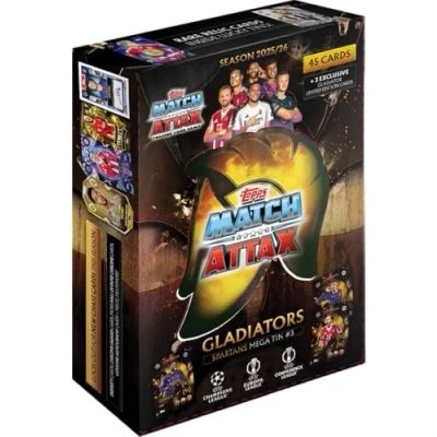 Topps UCC Match Attax 2025/26 Mega Tin Spartans contains 45 cards plus 3 exclusive Gladiators LE cards.