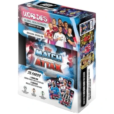 Topps UCC Match Attax 2025/26 Mini Tin Global Goalscorers contains 28 cards plus a random Star Boy LE and 3 exclusive 'Worldies' cards.