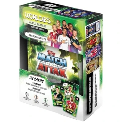 Topps UCC Match Attax 2025/26 Mini Tin World Beaters contains 28 cards plus a random Star Boy LE and 3 exclusive 'Worldies' cards.