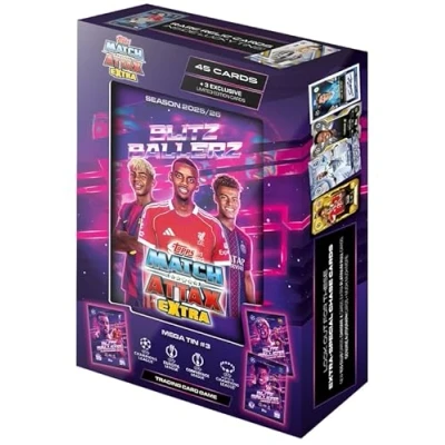 The Blitzballers Mega Tin contains 48 cards including 3 Blitzballers LE cards. Look out for rare relic cards inside lucky tins! Every packet of Match Attax Extra is built for hits - 4 inserts per pack and a bold promise: THESE PACKS ARE EXTRA-STACKED! Look out for New Wing Man inserts, Hat Trick Heros, Build-A-Baller puzzle chase cards, 3D X-Lens, UCL Royal Elite cards along with genuine autographs, player-worn jersey relics and brand-new foil finishes. Official Licensed UEFA Product., Manufacturer: Topps