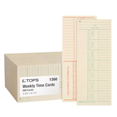 TOPS Time Cards, Weekly, 2 Sided, Named Days, 3 3/8" x 8 1/4", Manila, Green/Red Print, 500 Count (1260)
