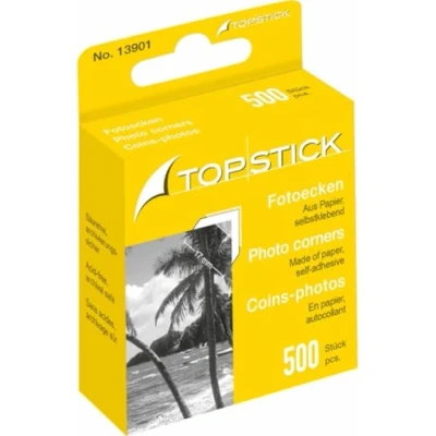 Self-adhesive photo corners for sticking photos and postcards into photo albums Almost completely invisible due to protruding transparent pockets The photos can be removed and reinserted as often as required Solvent-free and acid-free adhesive, edge length: 2 cm Scope of delivery: 500 TopStick photo corners in a practical dispenser box, transparent