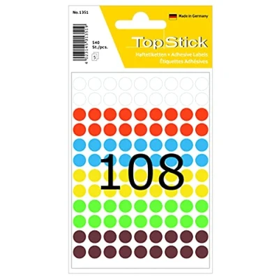 For marking and highlighting important information and markings with a signal character Ideal for pin boards and flipcharts, meetings, presentations, vacation planners and incoming goods Environmentally friendly and sustainable: solvent-free adhesive, chlorine-free bleached and PVC-free Can be written on with all common writing implements, not suitable for printing on a PC Scope of delivery: 5400 x TopStick colour point stickers, Ø 0.8 cm, round, multicoloured / coloured (50 sheets of 108 labels each)