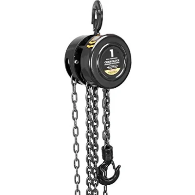 Manual hand lift chain block hoist features a 1 ton (2,000 lb) load capacity and is fitted with a mechanical load brake that allows for precise operation 1/4" diameter chains are constructed from premium 20Mn2 alloy steel with a black oxide finish for added resistance from corrosion and grime; Load-sharing gears makes lifting heavy loads easy Equipped with (2) heavy-duty steel hooks with a safety latch clasp that rotate a full 360-degrees without twisting and bending; Rotating components are mounted on roller ball bearings to reduce friction and increase efficiency Ideal for industrial settings and job applications such as factories, construction sites, garages, workshops, warehouses, farms, docks, wharves, and mines Meets ASME B30.16 overhead hoist safety standards to ensure safety; Includes a limited 1 year manufacturer warranty