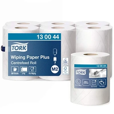 Tork 2 ply wiping paper roll for quick absorption - suitable for wiping, cleaning and is particularly good for cleaning glass Basic wiping paper roll is designed for light wiping tasks used in a centrefeed dispenser it can be easily operated with one hand Tork paper wipes with QuickDry are highly absorbent, for more efficient wiping and cleaning with less waste - reduced consumption and improved hygiene due to one-at-a-time dispensing Tork paper towel roll is EU Ecolabel certified and designed for easy carrying, opening and disposal / Approved for short contact with food Items delivered: 6 x basic wiping roll, white, compatible with Tork M2 centrefeed system, 23.5x34cm (WxL), Ø 19cm, 368 sheets per roll, 125 m per roll Item diameter: 1.0 centimeters