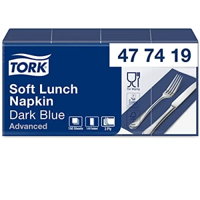 The 3-ply Tork soft dark blue lunch napkin with 1/8 fold is suitable for all casual occasions / Create a festive atmosphere by matching the napkin to the season Soft, navy blue serviette is ideal for fast food restaurants serving light meals & snacks / 1/8 head pre-folded napkin is convenient & leaves a quality impression 1/8 book napkin with proven performance and cost-efficiency to enhance the guest's experience / Tork EasyHandling for better carrying, opening and disposing of packaging The midnight blue serviette is authorised for short food contact & wiping / EU Ecolabel certified / Protected by a plastic bag for improved hygiene and handling Items delivered: 10 napkin bundles x 150 sheets, dark blue, 3 ply / 1500 sheets in total / Unfolded WxL: 32.6cm x 33cm / Folded WxL: 8.2cm x 16.5cm