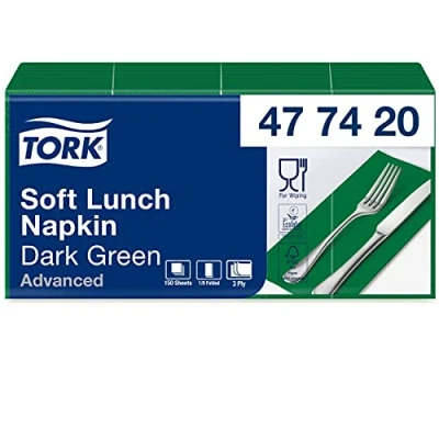 The 3-ply Tork soft green lunch napkin with 1/8 fold is suitable for all casual occasions / Create a festive atmosphere by matching the napkin to the season Soft, dark green serviette is ideal for fast food restaurants serving light meals & snacks / 1/8 head pre-folded napkin is convenient & leaves a quality impression 1/8 book napkin with proven performance and cost-efficiency to enhance the guest's experience / Tork EasyHandling for better carrying, opening and disposing of packaging The serviette is authorised for short food contact & wiping / EU Ecolabel certified / Protected by a plastic bag for improved hygiene and handling Items delivered: 10 napkin bundles x 150 sheets, dark green, 3 ply / 1500 sheets in total / Unfolded WxL: 32.6cm x 33cm / Folded WxL: 8.2cm x 16.5cm