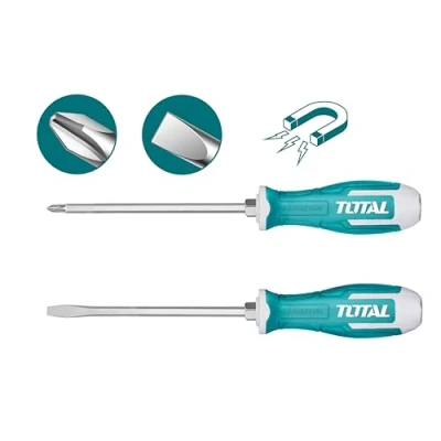 PACK OF 2 INDUSTRIAL SCREWDRIVERS: Practical and sturdy tool set consisting of 2 screwdrivers with magnetic tip, 1 flat tip and 1 Phillips. To ensure their strength, they have been made of steel. DURABLE MATERIAL: Made of steel, a strong alloy between iron and carbon, which stands out for its long service life and high resistance to rubbing, rust and corrosion. COMFORT: The kit provides you with a simpler and safer way of working thanks to the union between quality and resistance of its materials. It will help you achieve an excellent professional level finish. WHAT'S INCLUDED: Contains 1 set of 2 screwdrivers, made of steel, and 1 cardboard box with hanger for hanging. Flat head screwdriver: SL6,5 x 125 mm. Phillips screwdriver tip: PH2 x 125 mm PROFESSIONAL QUALITY: When performing renovation and maintenance work, it is essential to have the right tools. Total Tools Screwdriver Set allows you to tighten and loosen screws precisely and firmly., Weight: 2.7337320488 Pounds, Manufacturer: Total tools