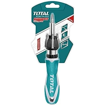 MULTIPOINT SCREWDRIVER: This screwdriver is a multifunctional tool that allows you to tackle a wide range of jobs. Thanks to its 7 interchangeable bits, you can use it in different types of screws and various tasks. HIGHER COMFORT: The handle with ratchet function allows you to perform back-and-forth movements for faster and more efficient screwing or unscrewing. This feature also reduces fatigue and strain on the hands during works. TECHNICAL SPECIFICATIONS: The screwdriver and interchangeable bit set has 2 flat bits (SL5 - SL6), 3 Phillips bits (PH1 - PH2 - PH3) and 2 Torx bits (T15 - T2). Screwdriver with ratchet function 22 teeth. FUNCTIONALITY: This tool with accessories is indispensable for tightening and loosening a variety of screws. Perfect for repair, maintenance and DIY work around the home, workshop or garage. PROFESSIONAL QUALITY: When performing renovation and maintenance work, it is essential to have the right tools. Total Tools Interchangeable Bit Driver lets you tackle a wide range of screwing and unscrewing jobs., Weight: 0.440924524 pounds, Manufacturer: Amig