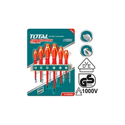 PACK OF 6 SCREWDRIVERS: Practical and sturdy tool set consisting of 3 screwdriver with flat tip and 3 Phillips screwdriver tip. To ensure their strength, they have been made of steel. DURABLE MATERIAL: It has been made of chrome vanadium, a strong alloy between iron and carbon, which stands out for its long service life and its high resistance to rubbing, rust and corrosion. COMFORT: This screwdriver provides you with a simpler and safer way of working thanks to the union between quality and resistance of its materials. It will help you achieve an excellent professional level finish. WHAT'S INCLUDED: Contains 1 set of 6 insulated screwdrivers, made of steel, and 1 cardboard container with hanger for hanging. Includes 3 flat tip and 3 Phillips tip with hex shaft. 1 x SL6 100 1 x SL6 150 1 x SL8 200 1 x PH2 100 1 x PH2 150 1 x PH3 200 PROFESSIONAL QUALITY: When performing renovation and maintenance work, it is essential to have the right tools. Total Tools screwdrivers allow you to tighten and loosen screws precisely and firmly.
