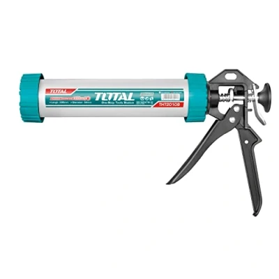 SILICONE APPLICATOR - Ensures precise distribution for sealing joints, repairing cracks and bonding materials in DIY projects. Compatible with standard cartridges, offers versatility and practicality. (Not include silicone bottles). DETAILS - Made with high quality steel, this silicone applicator is rust and corrosion resistant, ensuring a long service life. Closed applicator ensures precision and prevents spills and drips. Length: 305 mm GRIP: The professional silicone gun features an ergonomic aluminum handle, which provides comfort and safety during use. It is a product that reduces fatigue, allows a firm grip and total control. It features a push mechanism that allows for even distribution of material and facilitates precision in application. USES: Ideal for DIY jobs such as sealing joints in bathrooms, kitchens and windows. Perfect for crafts and tasks requiring precision, as well as in woodworking or trim installation, ensuring professional finishes. Contents: 1 x gun for silicone cartridges with a diameter of 55 mm and a thickness of 2.2 mm. PROFESSIONAL QUALITY: When performing renovation and maintenance, it is essential to have all the right tools for your DIY projects. At TOTAL we offer you a functional and practical solution with our products. We have a catalog of hand tools, battery-powered, corded, accessories and gardening tools., Manufacturer: Total Tools
