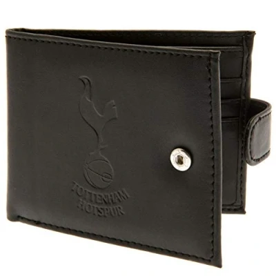Tottenham Hotspur FC rfid Anti Fraud Wallet. Black leather wallet with RFID anti fraud technology. Features a large debossed club crest and secure stud fastener. 3 card slots and a window compartment. 2 note compartments. 1 additional compartment. Official licensed product. Size: Approx 11cm x 9cm | Packaging: In a display box