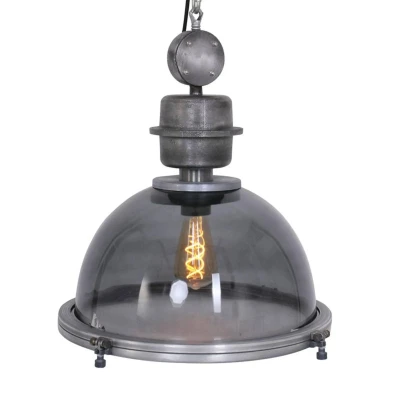 Unusual hanging lamp Bikkel with grey-transparent glass shadeThe hanging lamp Bikkel is an exciting eye-catcher due to its industrial design. The suspension alone is very unique and hardly comparable with other lights. The transparent lampshade has a semicircular shape that is open at the bottom. It consists of dark glass and is covered in the lower part by a satin diffuser, which is fixed with three clamps. The whole thing results in a rustic, industrial style that makes the Bikkel pendant lamp a highly decorative piece of furniture. Thus, it can be used as an eye-catcher in the kitchen area as well as above a lavish dining table and exude its rustic charm. The diffuser creates a generous and glare-free illumination that is appropriate for all everyday situations.