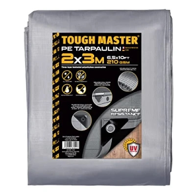 DURABLE FABRIC: This large tarpaulin from TOUGH MASTER is created from 90 grams of woven polyethylene fabric per square metre that’s a full 10x10 fibre strands per square inch. The triple laminated construction means that this water resistant tarpaulin is extra durable ADDED REINFORCEMENT: We reinforce the hemmed edges of our tarpaulin sheet with woven rope for added strength even in high stress applications. Extra thick fabric sections are sewn at the corners of this tarpaulin sheet ensure added durability. The heat bonded edges have strong, rust and corrosion resistant aluminium grommets every 1 metre for easy, secure tie downs DAMAGE RESISTANT: It’s created from water resistant polyethylene tarpaulin cloth that is also UV resistant, mildew, weather and tear resistant. The strong, rust resistant metal grommets every 1 metre ensure easy, secure tie downs VERSATILE: For added versatility, this strong tarpaulin sheet is reversible: green on one side, blue on the other. This rugged tarpaulin sheet has grommets along all 4 edges for easy, secure tie downs. Use this large tarpaulin over your car or tools, store your dry firewood or use as a ground sheet PORTABLE: This large tarpaulin is created from water resistant polyethylene tarpaulin cloth that is as lightweight, easy to handle and easy to fold as it is hard wearing. Thanks to its reinforced hems, the edges resist fraying when you handle them