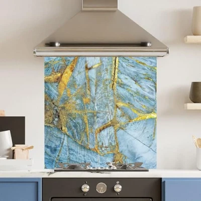 Toughened 6mm Glass Kitchen Splashback 60 x 60cm Light blue Gold Marble Polished Heat Resistant Back Splash for Cookers Hob