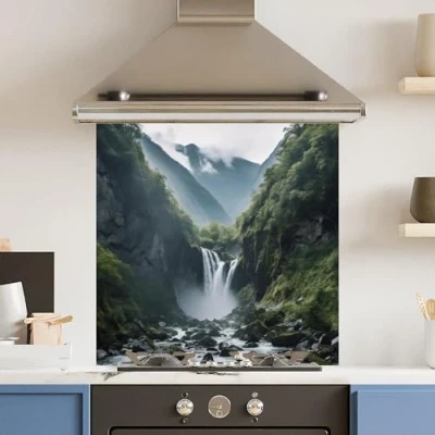 Toughened 6mm Glass Kitchen Splashback 60 x 60cm Waterfall Landscape Polished Heat Resistant Back Splash for Cookers Hob