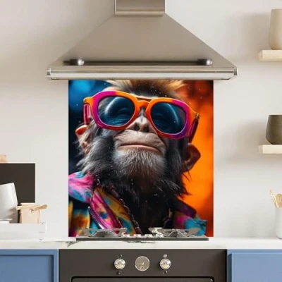 Toughened 6mm Glass Kitchen Splashback 60 x 65cm Monkey Glasses Polished Edge Heat Resistant Back Splash for Cookers Hob