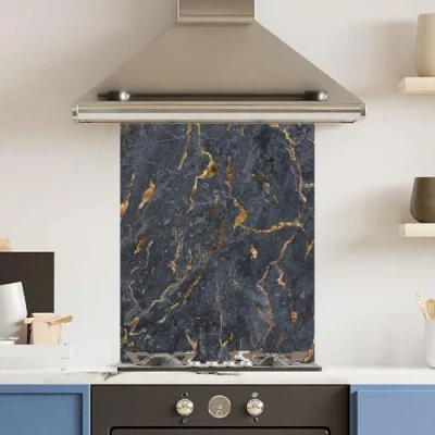 Toughened 6mm Glass Kitchen Splashback 60 x 75cm Black Marbled Surface Polished Heat Resistant Back Splash for Cookers Hob
