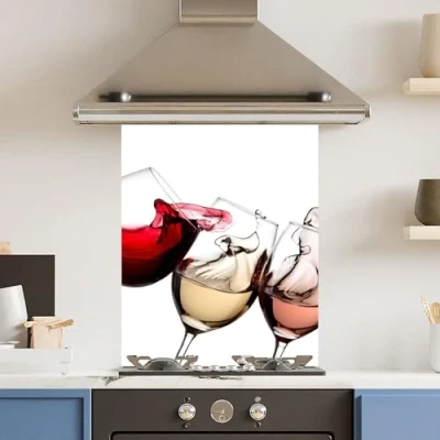 Toughened 6mm Glass Kitchen Splashback 60 x 75cm White 3 Wine Glasses Polished Heat Resistant Back Splash for Cookers Hob