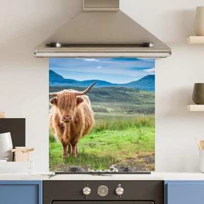 Toughened 6mm Glass Kitchen Splashback 70 x 75cm Green HighHighland Cow Polished Heat Resistant Back Splash for Cookers Hob
