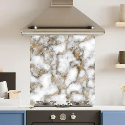 Toughened 6mm Glass Kitchen Splashback 70 x 75cm White Gold Marble Polished Heat Resistant Back Splash for Cookers Hob